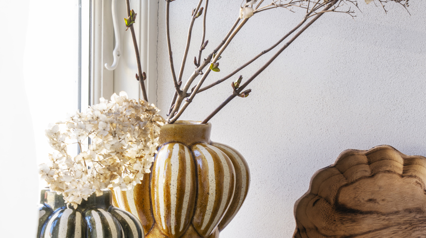 Start with your furniture’s mood to enhance the overall decor. Pale wood and natural fibres love the gentle tactility of stoneware. Black framed shelving or concrete floors feel lifted by warm metallics. A colourful rug or gallery wall can be tamed by a row of simple matte pots in oatmeal and clay.