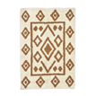 This tufted cotton bath mat, made in India, features an ethnic pattern with off white and mustard colors. It offers a soft feel underfoot with a non-slip latex backing for safety. Ideal for enhancing bathroom aesthetics.