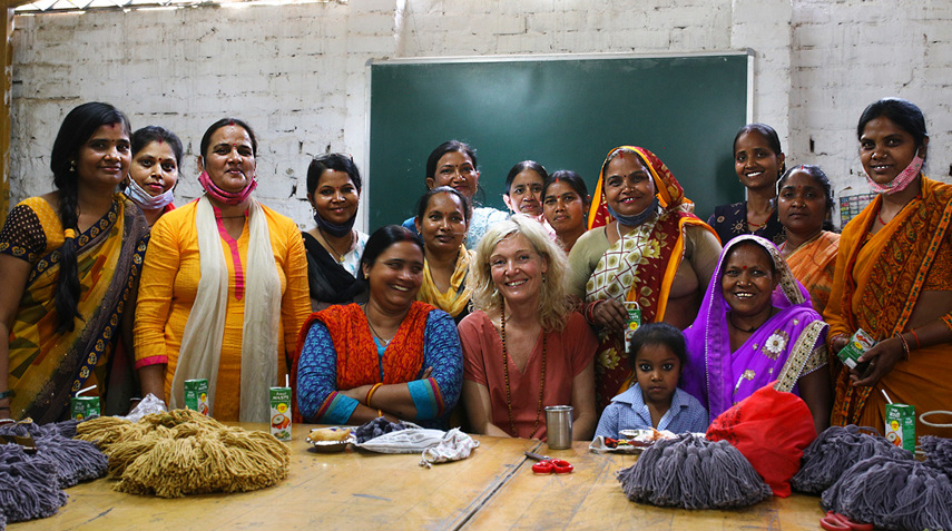 Pernille visiting the talented women at Nai Disha who handcraft the signature tassels for our textiles.