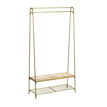 In this iron clothes rack w/ shelves, hard iron meets soft wood. Strong iron tubing forms a stable frame, while smooth mango wood brings warmth and texture. Powder coated iron in ant.brass, natural tones adds a soft industrial mood that works with many interiors. Open construction keeps the floor visible and makes it easy to see shoes, bags and folded knitwear at a glance.Care and maintenance